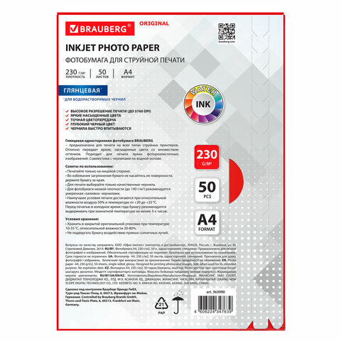 Фотобумага глянцевая, А4, 230 г/м2, односторонняя, 50 листов, BRAUBERG ORIGINAL, 363990