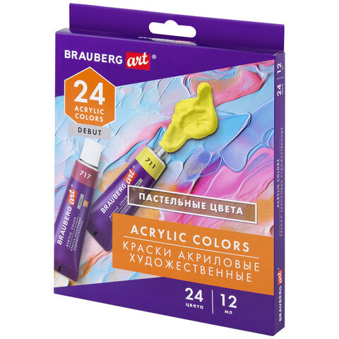 Краски акриловые художественные 24 ПАСТЕЛЬНЫХ цвета в тубах по 12 мл, BRAUBERG ART "DEBUT", 192408