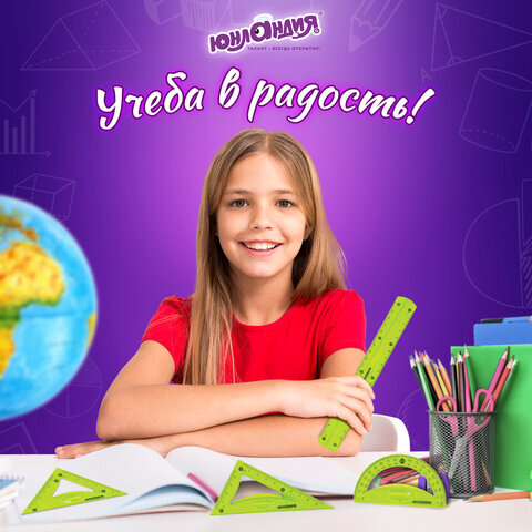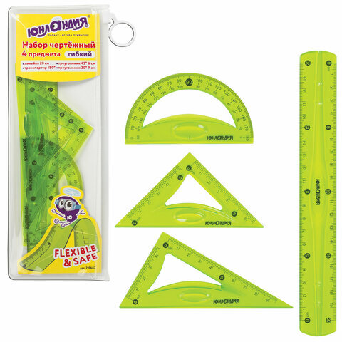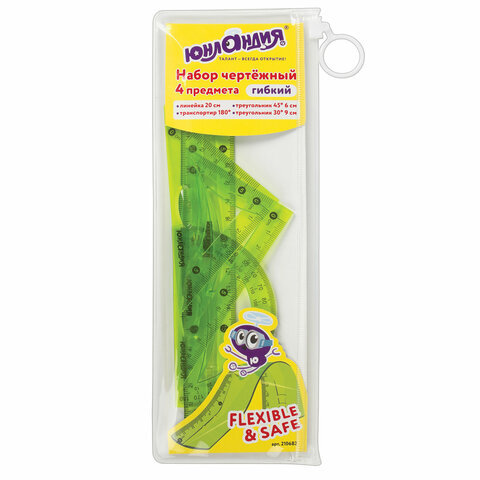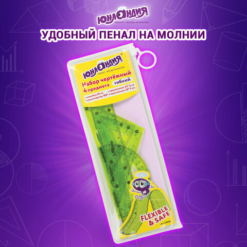 Набор чертежный средний гибкий ЮНЛАНДИЯ "FLEX" (линейка 20 см, 2 треугольника, транспортир), пенал, 210682