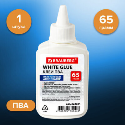 Клей ПВА BRAUBERG (бумага, картон, дерево), 65 г, 222924