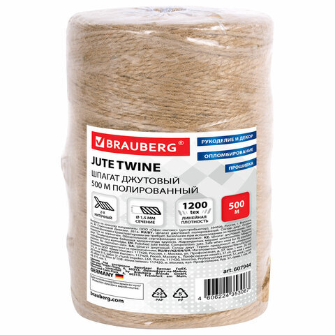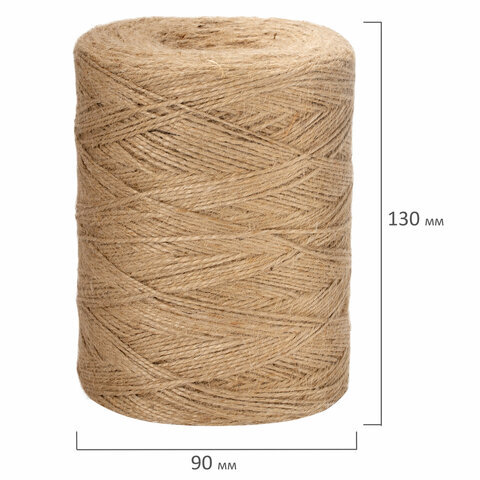 Шпагат джутовый полированный длина 500 м диаметр 1,5 мм, 2-х ниточный, BRAUBERG, 607944