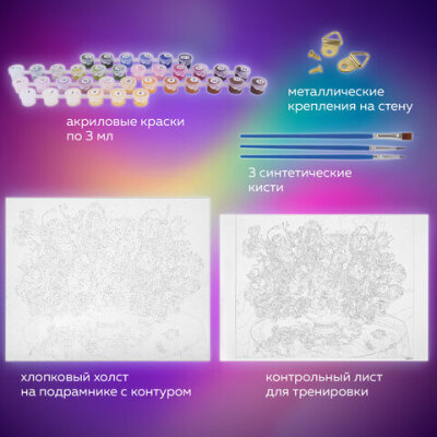 | Комплектация | акриловые краски, кисть, крепеж, лист бумаги для тренировки, холст на подрамнике |