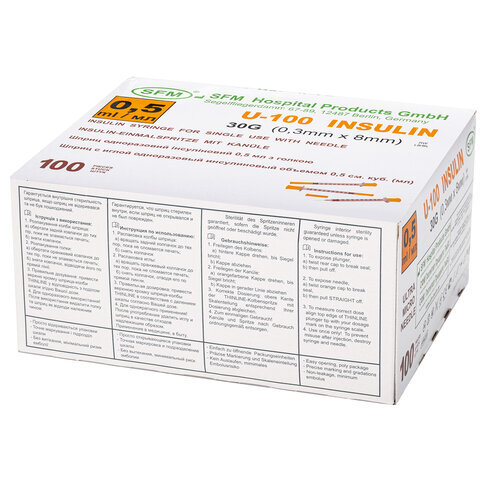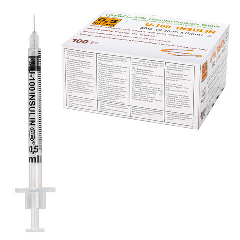 Шприц инсулиновый SFM, 0,5 мл, КОМПЛЕКТ 10 шт., в пакете, U-100 игла несъемная 0,3х8 мм - 30G, 534255