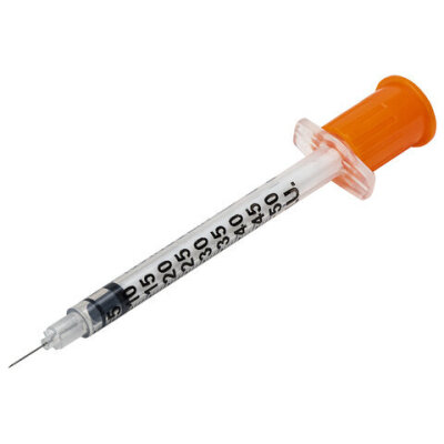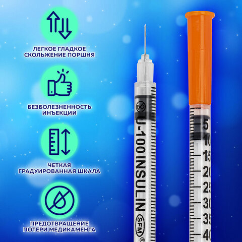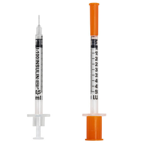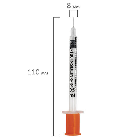 Шприц инсулиновый с интегрированной иглой состоит из трех компонентов: цилиндр, поршень и манжета. Имеет градуировку по шкале U-100, объем - 0,5 мл, размер иглы - 30G.