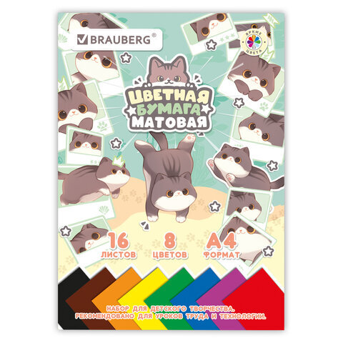 Цветная бумага А4 офсетная, 16 листов, 8 цветов, на скобе, кросс-серия "МИЛЫЕ КОТЫ", 200х275 мм, BRAUBERG, 116983