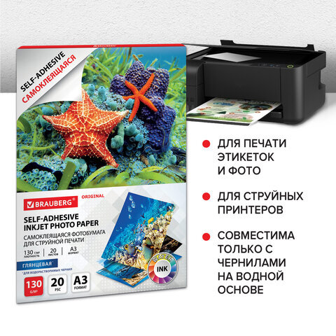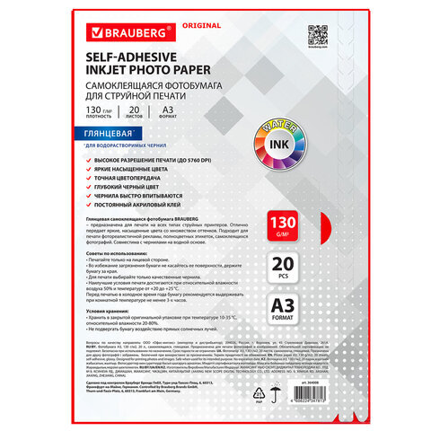 Фотобумага САМОКЛЕЯЩАЯСЯ глянцевая, А3, 130 г/м2, 20 листов, BRAUBERG ORIGINAL, 364008