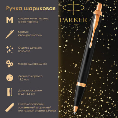 Ручка шариковая PARKER "IM Core Black Lacquer GT", черный глянцевый лак, позолота, синяя, 1931666