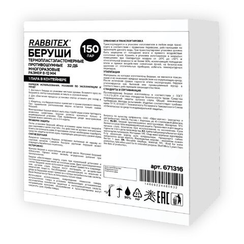 Беруши многоразовые термопластэластомерные без шнурка, 1 пара в контейнере, SNR 32 дБ, RABBITEX (РАББИТЕКС), 671316