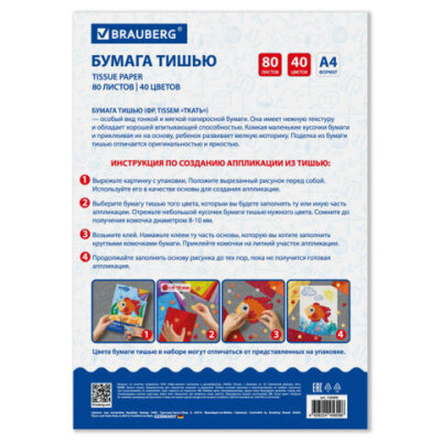 Цветная бумага ТИШЬЮ 17 г/м2, А4 (210х297 мм), 80 листов, 40 цветов в папке, BRAUBERG, 116499
