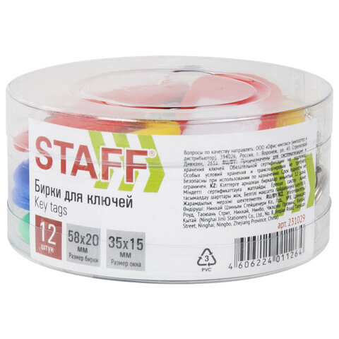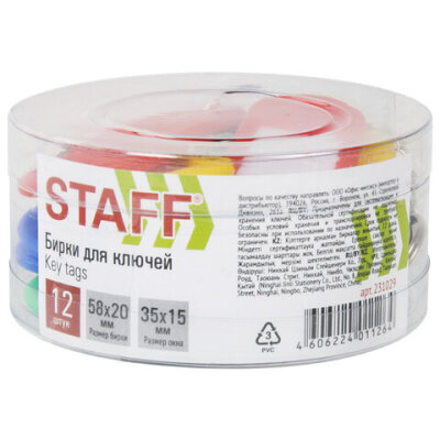 Бирки для ключей КОМПЛЕКТ 12 ШТ., длина 58 мм, инфо-окно 35х15 мм, АССОРТИ, STAFF "Basic", 231029