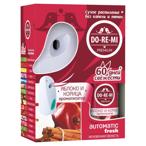 • Автоматический диспенсер с освежителем воздуха DO-RE-MI "Яблоко и корица" подарит вашему дому комфорт, уют, свежесть яблока и аромат корицы.