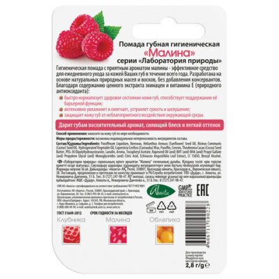 Гигиеническая помада ЛАБОРАТОРИЯ ПРИРОДЫ "Клубника" с приятным ароматом малины предназначена для ежедневного мягкого ухода за губами.