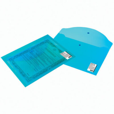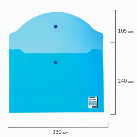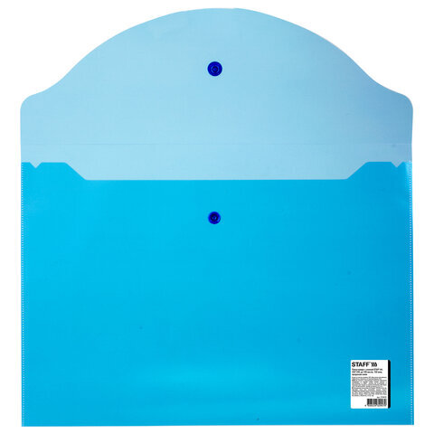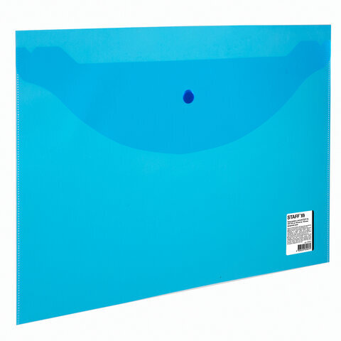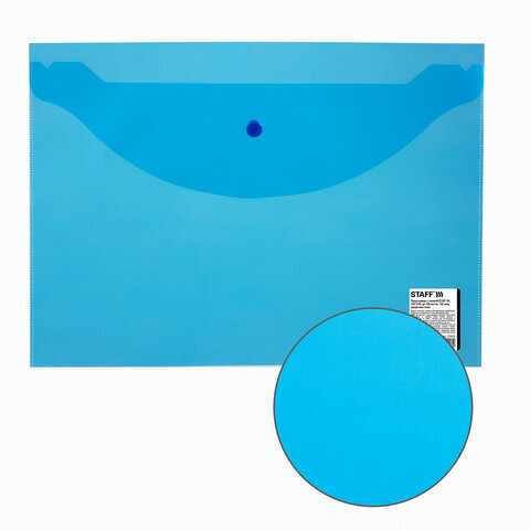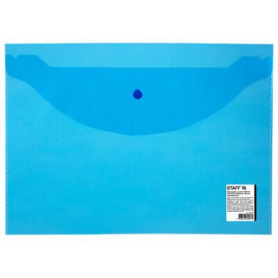 Папка-конверт с кнопкой STAFF, А4, до 100 листов, прозрачная, синяя, 0,15 мм, 270470