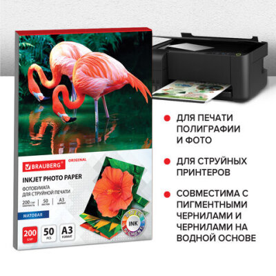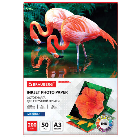 Фотобумага матовая БОЛЬШОГО ФОРМАТА, А3, 200 г/м2, односторонняя, 50 листов, BRAUBERG ORIGINAL, 363996