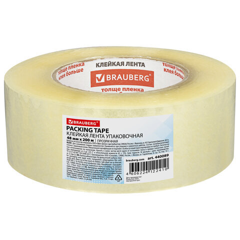 Клейкая лента упаковочная 48 мм х 200 м, прозрачная, толщина 45 микрон, BRAUBERG, 440089