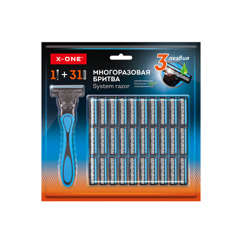Бритвенный станок многоразовый мужской, 3 лезвия, 31 кассета, синий, X-ONE (ИКС-УАН), 700024