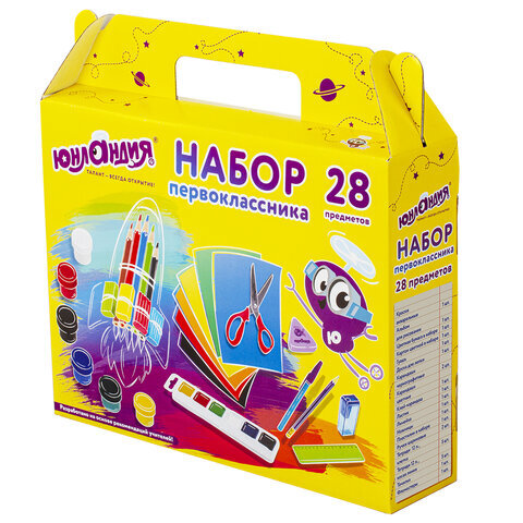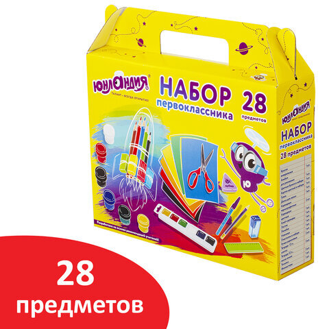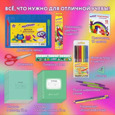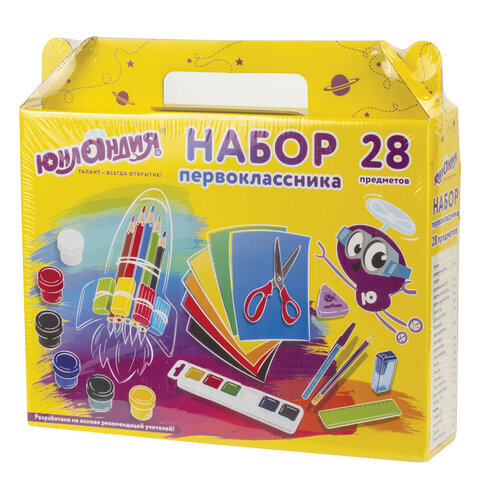 Набор канцелярских принадлежностей ЮНЛАНДИЯ "ПЕРВОКЛАССНИК" для выпускников детского сада и первоклассников в красочной упаковке. Скомплектован на основе рекомендаций учителей начальных классов.