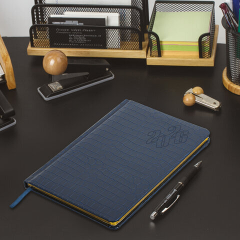 Еженедельник датированный 2026 А5 145х215 мм, BRAUBERG "Comodo", под кожу, темно-синий, 117167