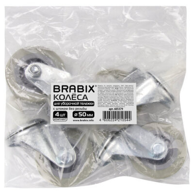 Колеса для уборочной тележки с штоком без резьбы, диаметр 50 мм, КОМПЛЕКТ 4 штуки, BRABIX, 605379