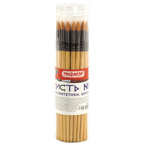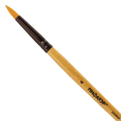 Кисть ПИФАГОР, СИНТЕТИКА, круглая, № 4, деревянная лакированная ручка, с колпачком, 200844