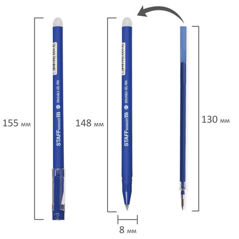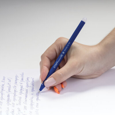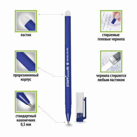 Ручка стираемая гелевая с удобным прорезиненным корпусом (soft-touch) пишет специальными гелевыми чернилами, которые становятся невидимыми при нагревании. Нагрев достигается ластиком, встроенным в корпус ручки.