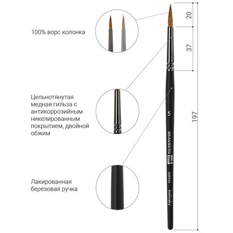 Кисть художественная проф. BRAUBERG ART CLASSIC, колонок, круглая, № 5, короткая ручка, 200934