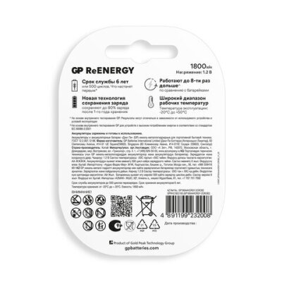Батарейки аккумуляторные GP ReEnergy Ni-Mh пальчиковые КОМПЛЕКТ 2 шт., AA (HR6), 1800 mAh, 180AAHCRGY, 180AAHCRGY-2CRC