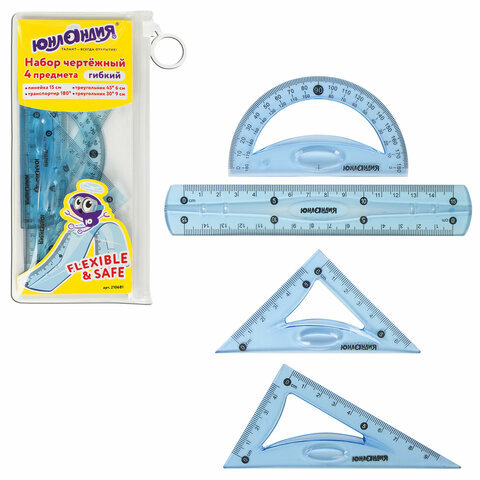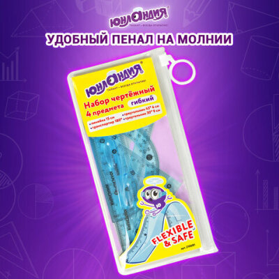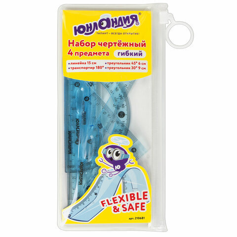 Набор чертежный малый гибкий ЮНЛАНДИЯ "FLEX" (линейка 15 см, 2 треугольника, транспортир), пенал, 210681