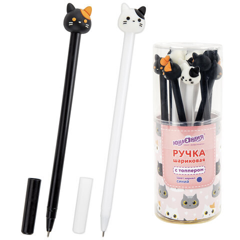 Ручка с топпером шариковая ЮНЛАНДИЯ "Кошка", корпус ассорти, СИНЯЯ, пишущий узел 0,7 мм, 143804