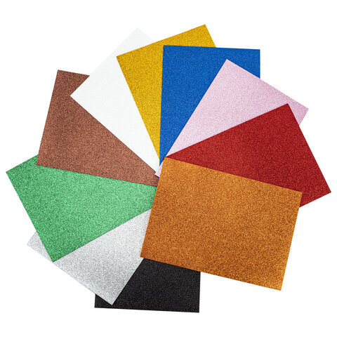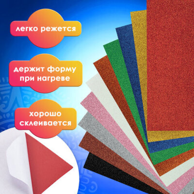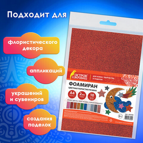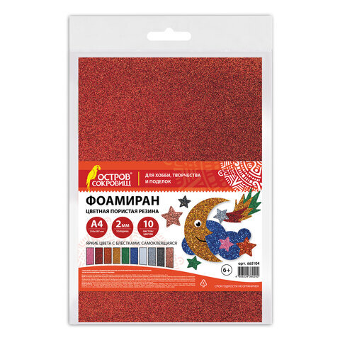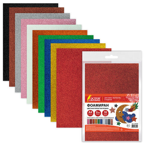 Пористая резина/фоамиран А4, 2 мм, НАБОР, 10 листов,10 ярких цветов, блестки, самоклеящаяся, ОСТРОВ СОКРОВИЩ, 665104