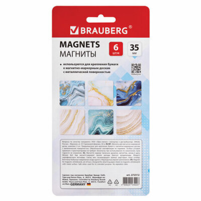 Магниты квадратные стеклянные 35 мм для досок магнитно-маркерных, НАБОР 6 шт., "Мрамор", BRAUBERG Glass, блистер, 272512