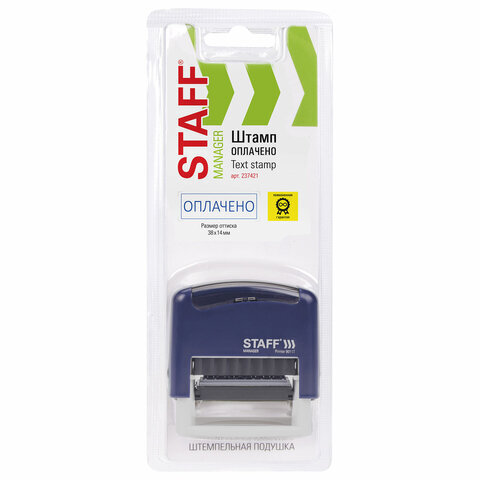 • Штамп STAFF "Printer 9011T" предназначен для создания оттиска со стандартным текстом "ОПЛАЧЕНО", что позволяет существенно экономить рабочее время при нанесении необходимых отметок на документы.