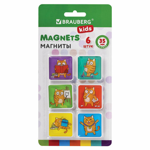 Магниты квадратные стеклянные 35 мм для досок магнитно-маркерных, НАБОР 6 шт., "Кот-энтузиаст" BRAUBERG KIDS, блистер, 272514