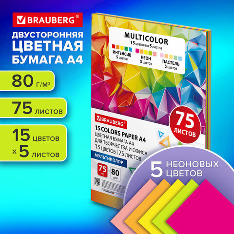 Бумага цветная 15 цветов BRAUBERG MULTICOLOR А4, 80 г/м2, 75 л. (15 цветов x 5 листов), 116647