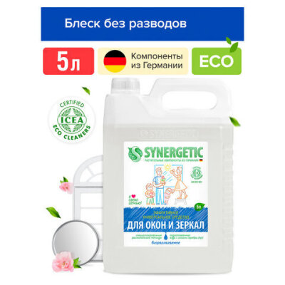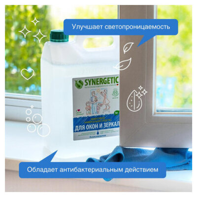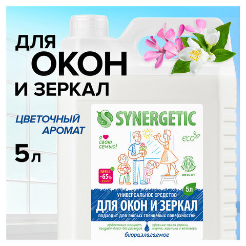 Средство для мытья стекол и зеркал с антибактериальным эффектом 5 л SYNERGETIC, биоразлагаемое, 96
