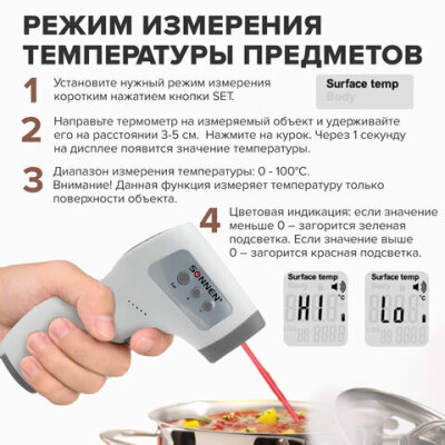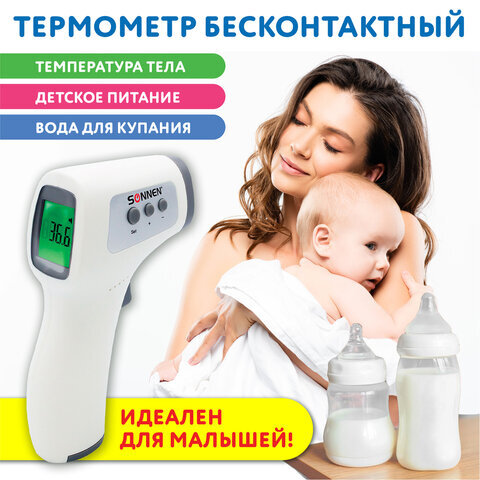 Бесконтактный инфракрасный термометр SONNEN NIT-2 определяет температуру тела человека, объекта или жидкости на дистанции и без контакта за 1 секунду.