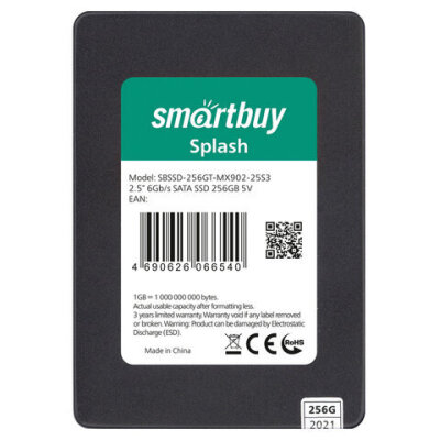 Твердотельный накопитель SSD SMARTBUY Splash 256GB, 2,5", SATA III, черный, SBSSD-256GT-MX902-25S3