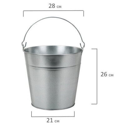 Ведро изготовлено из оцинкованной стали. Параметры ведра: диаметр нижний – 21 см, диаметр верхний – 28 см, высота ведра – 26 см.