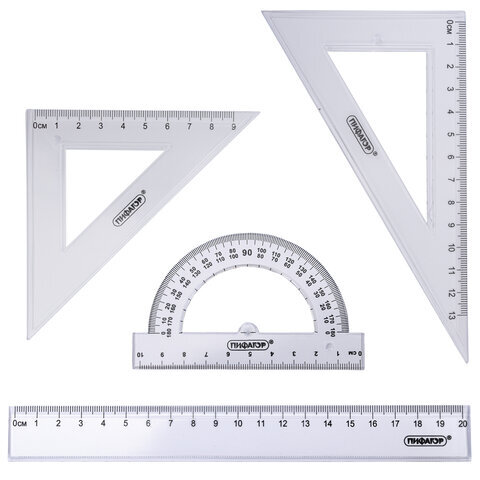 Набор чертежный ПИФАГОР (линейка 20 см, 2 треугольника, транспортир), прозрачный, 210852