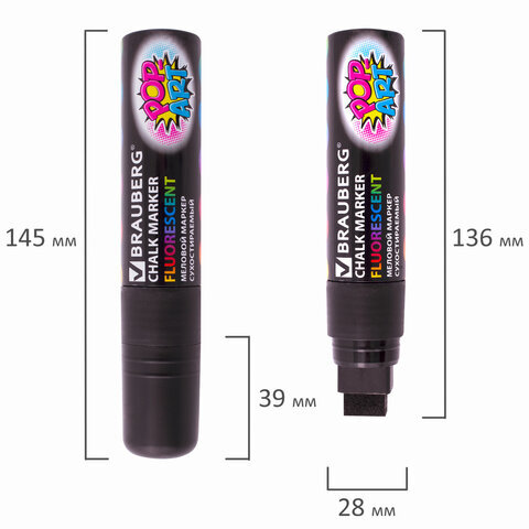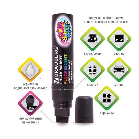 • Стираемый меловой маркер BRAUBERG "POP-ART" - оригинальный инструмент для оформления различных зон помещений. Идеален для использования на школьных занятиях и детского творчества.