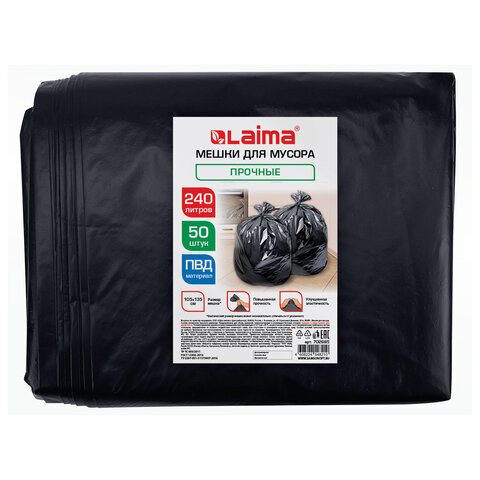 Мешки для мусора 240л черные в пласте 50 штук прочные, ПВД 40 мкм, 105x135см, LAIMA, 702685