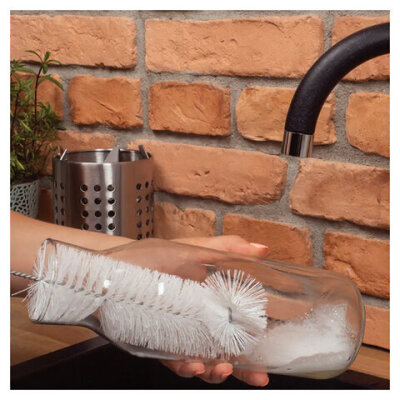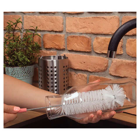 Ёршик для мытья бутылок идеально подходит для чистки бутылок, ваз, мензурок. Щетина средней жесткости (6х17 см), прикрепленная к оцинкованной проволоке, относительно гибкой, заканчивающейся пластиковой ручкой. Имеет специальное отверстие для крючка.