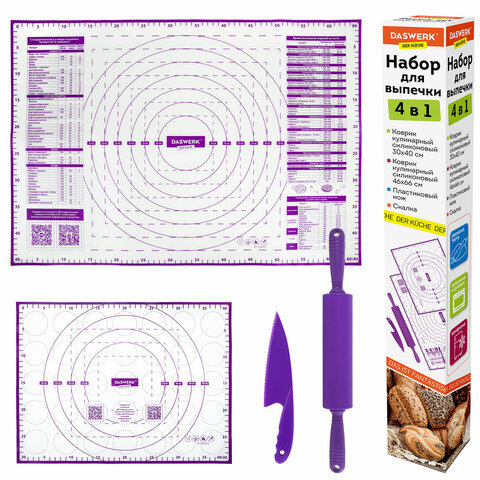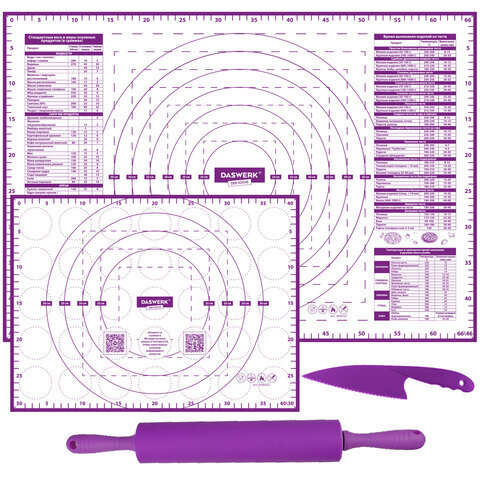 Коврики силиконовые для выпечки 4 в 1: Коврики 30х40 см / 46х66 см, Нож 24 см, Скалка, DASWERK (ДАСВЕРК), 608429