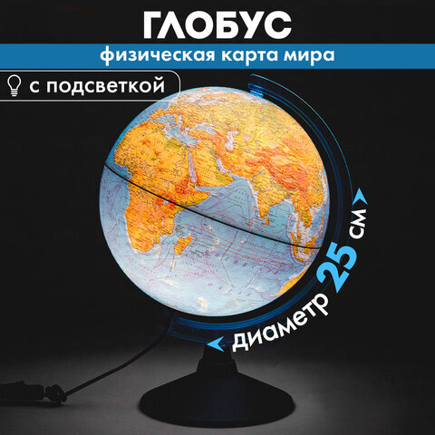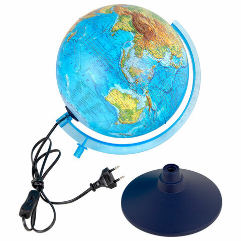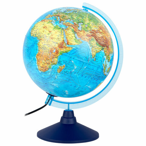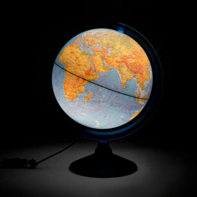 Глобус позволит ознакомиться с физической картой мира. Подходит для использования в детских садах и школах. Поможет узнать рельеф земной поверхности, абсолютные глубины океанов, найти самые высокие и самые глубокие места планеты.