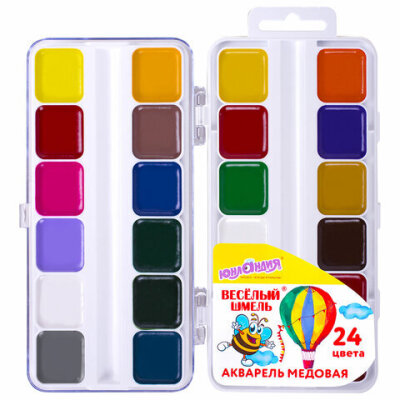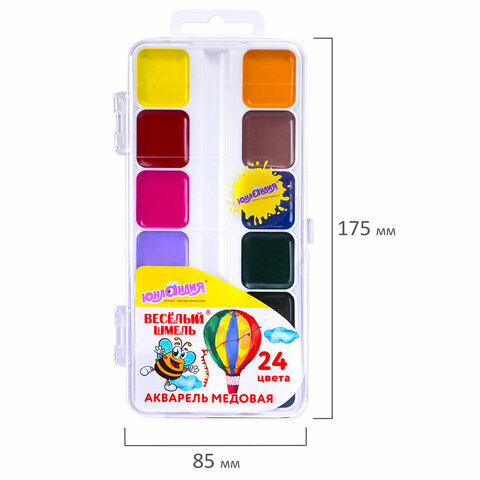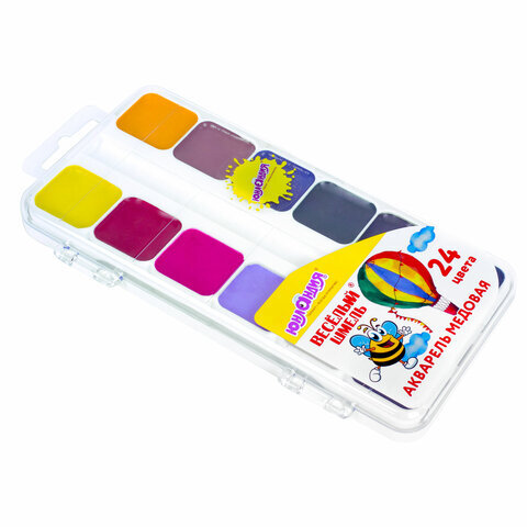 Краски акварельные ЮНЛАНДИЯ "ВЕСЁЛЫЙ ШМЕЛЬ", медовые, 24 цвета, квадратные кюветы, пластик, 192363