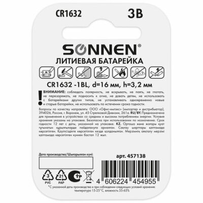 Батарейка литиевая SONNEN Lithium CR1632, "таблетка, дисковая, кнопочная", 1 шт., блистер, 457138