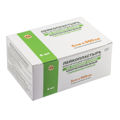 Лейкопластырь медицинский фиксирующий в рулоне LEIKO 5х500 см, на нетканой хлопчатобумажной основе, в картонной коробке, 531720