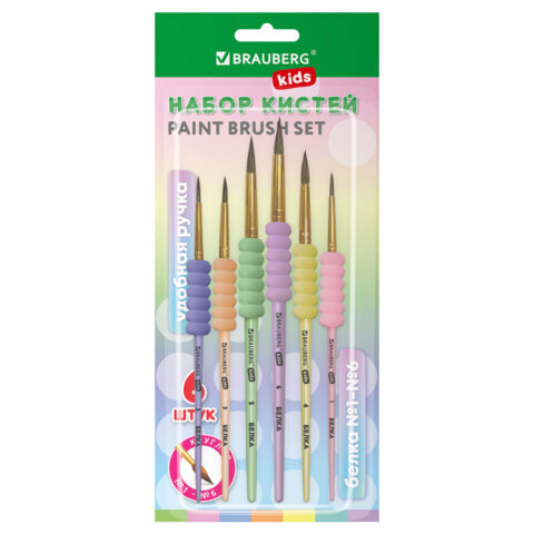 Кисти c EVA-вставкой БЕЛКА набор 6 шт. (круглые №1, 2, 3, 4, 5, 6), блистер, BRAUBERG KIDS, 201093