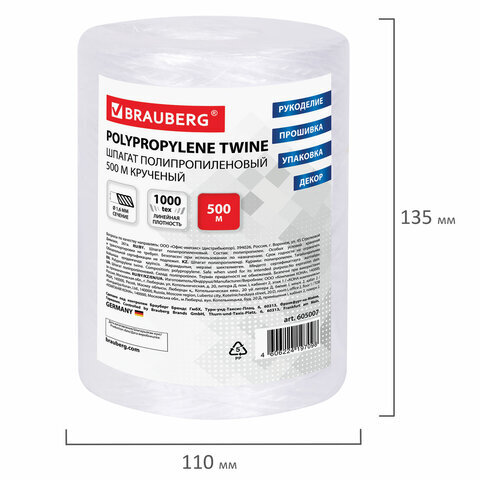 • Полипропиленовый шпагат BRAUBERG отлично подходит для хозяйственных и бытовых нужд в домашнем и дачном хозяйстве. Активно применяется в обвязке, упаковке товаров и посылок, подвязки растений и деревьев, плетении, декорировании.