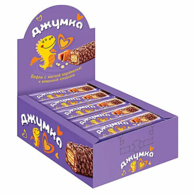 Батончик вафельный ДЖУМКА - это хрустящая вафля с мягкой карамелью, воздушной кукурузой в молочно-шоколадной глазури.